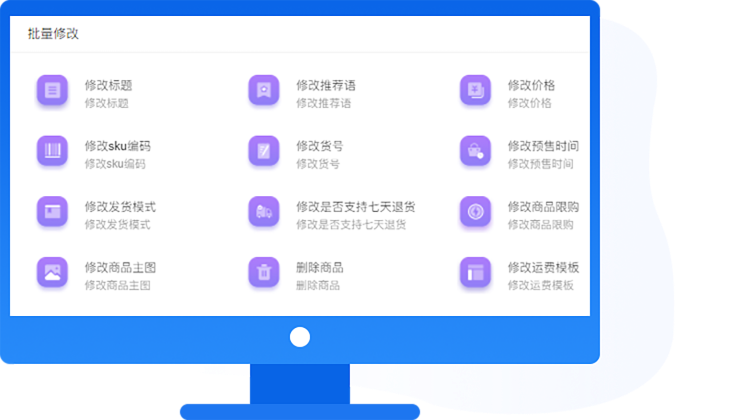 支持批量修改标题、价格、库存、商家编码、货号、主图、详情、品牌、属性、