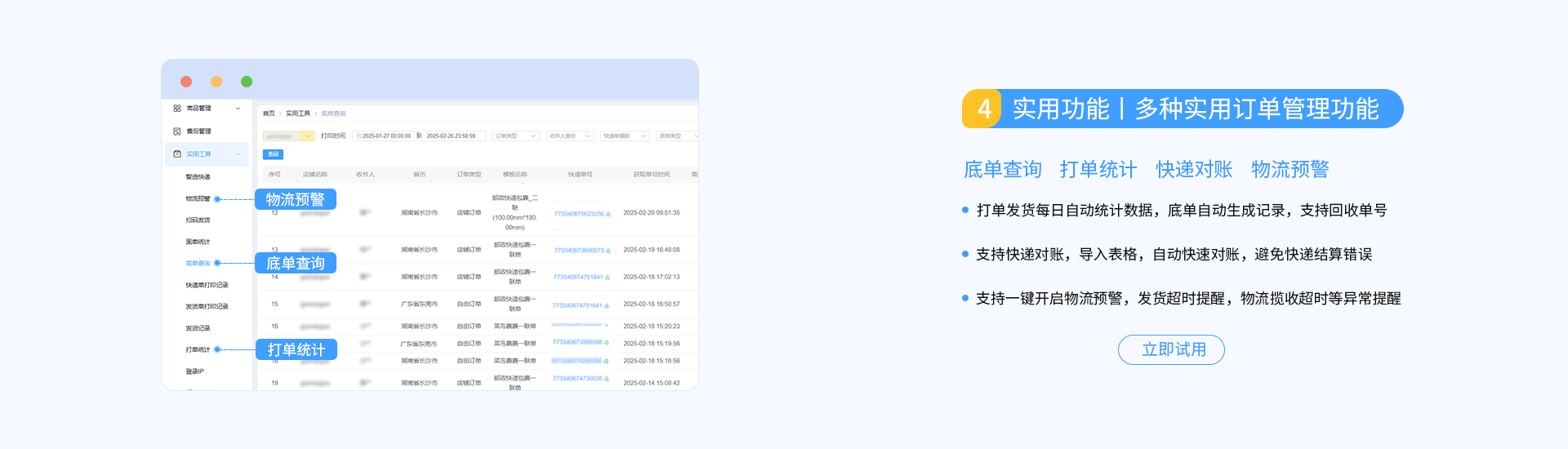 底单查询 打单统计 快递对账 物流预警